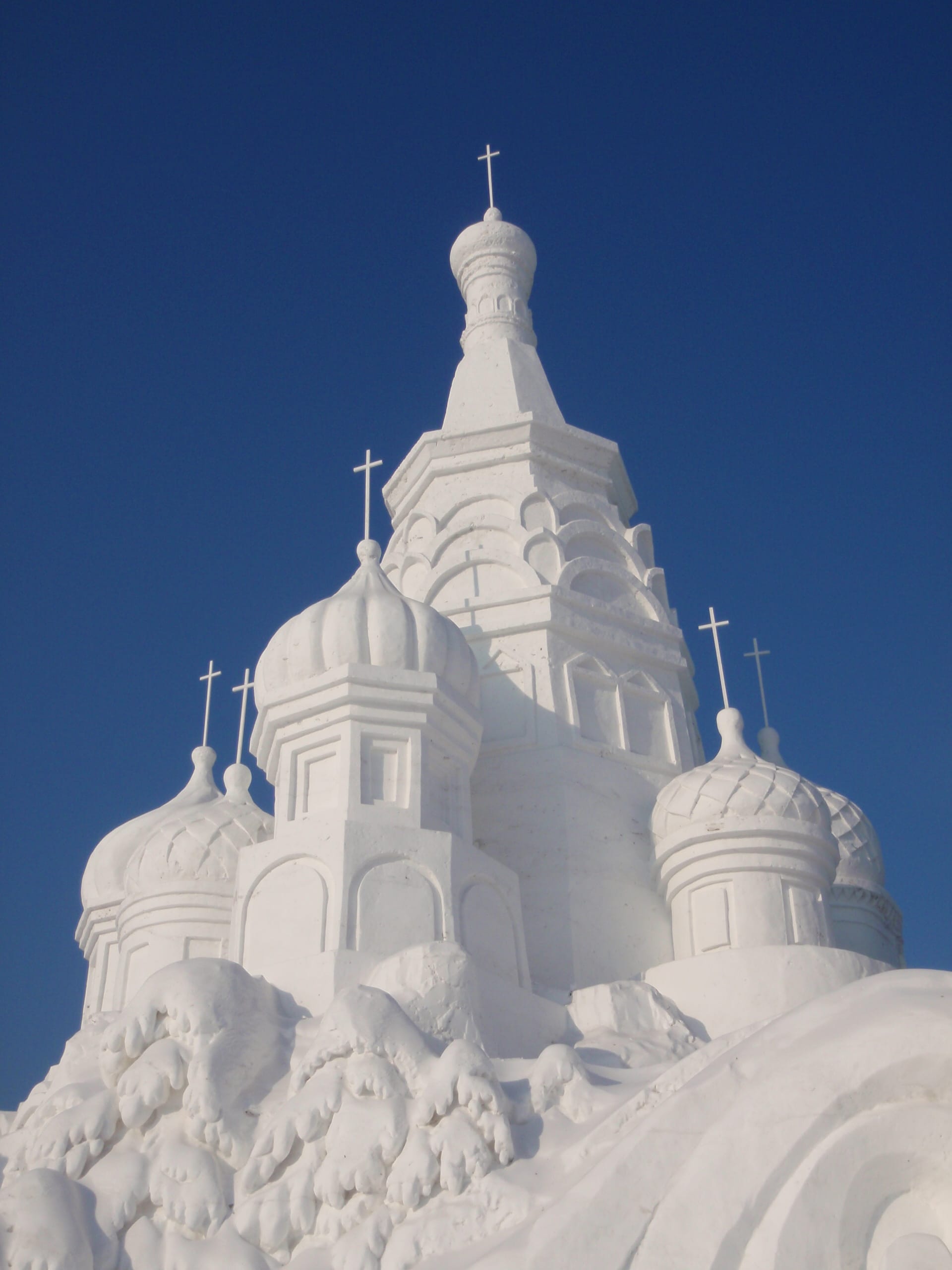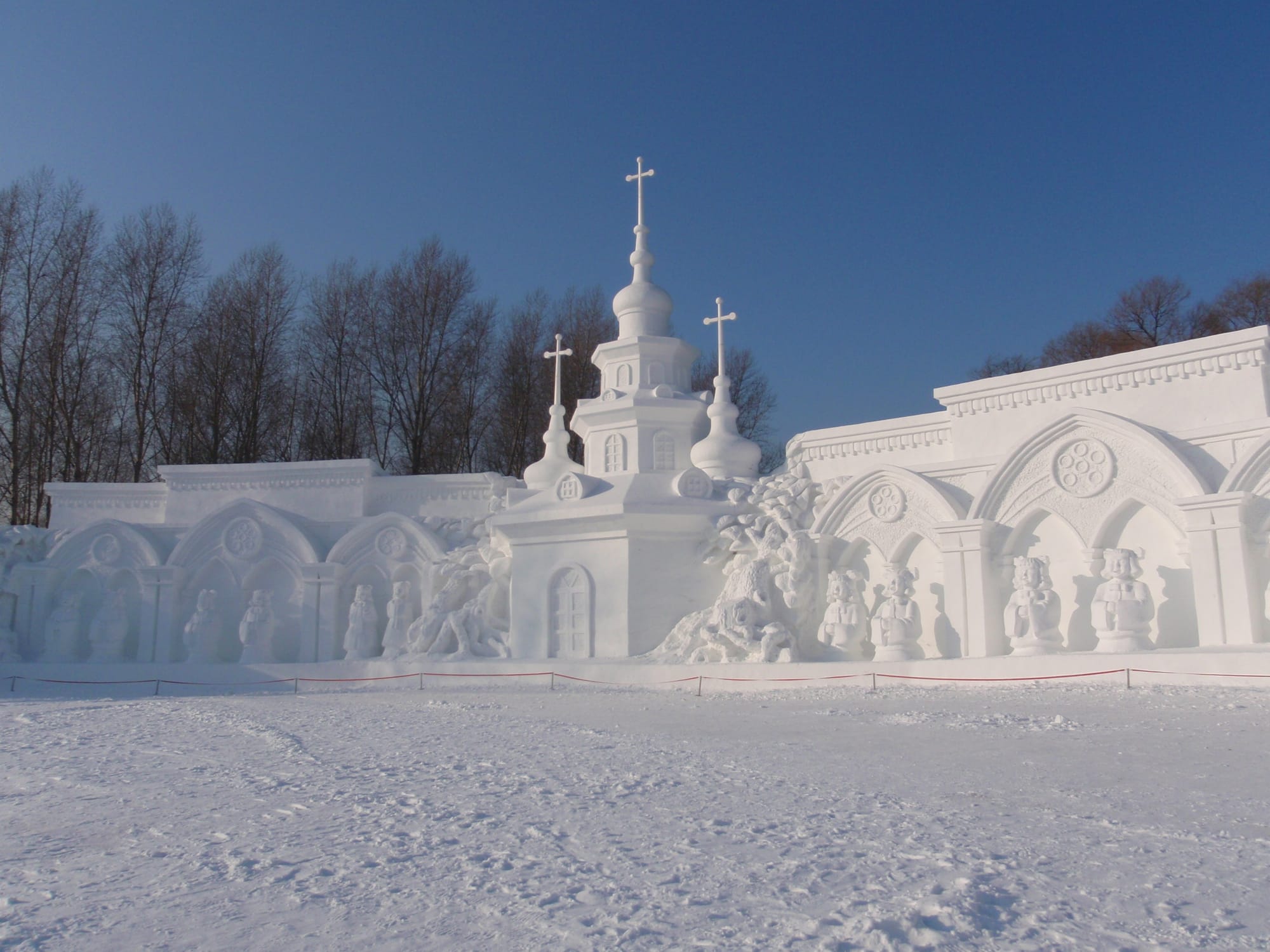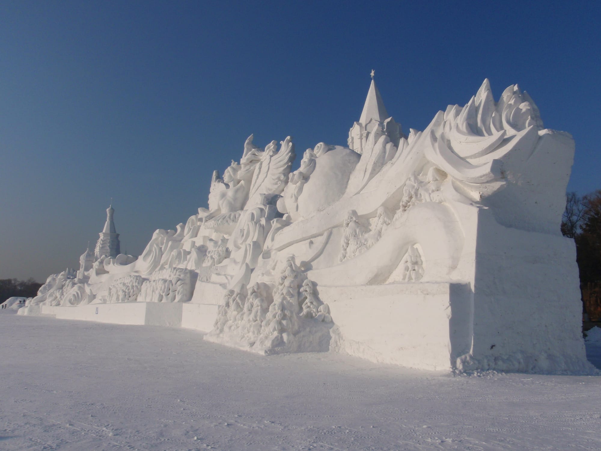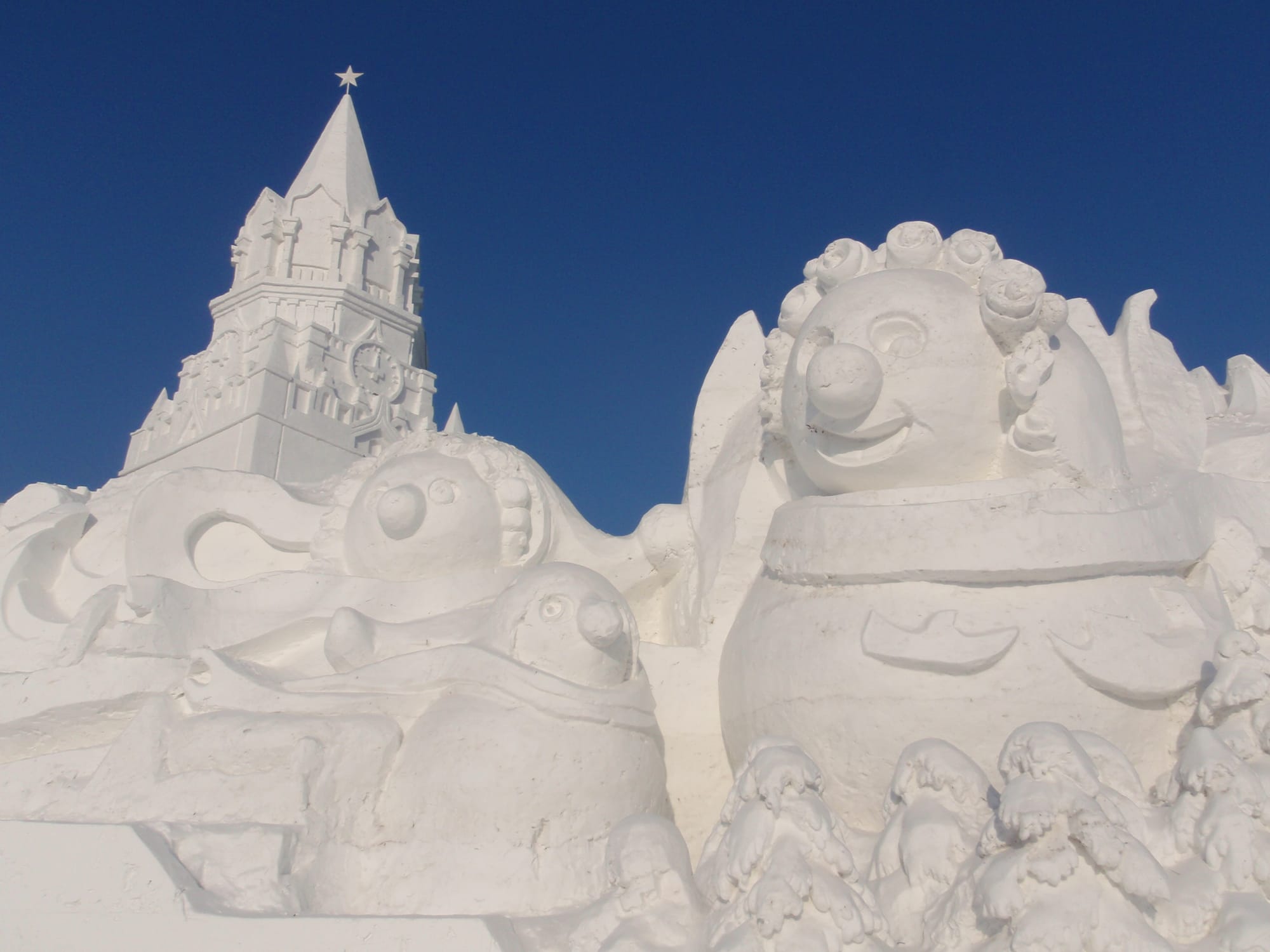 In winter, the island transforms into a vast, white canvas for international artists where it hosts the annual Snow Sculpture Art Exposition, featuring massive and intricate sculptures. Many depict towering figures, historical scenes and architectural replicas, often record-breaking in size and detail.