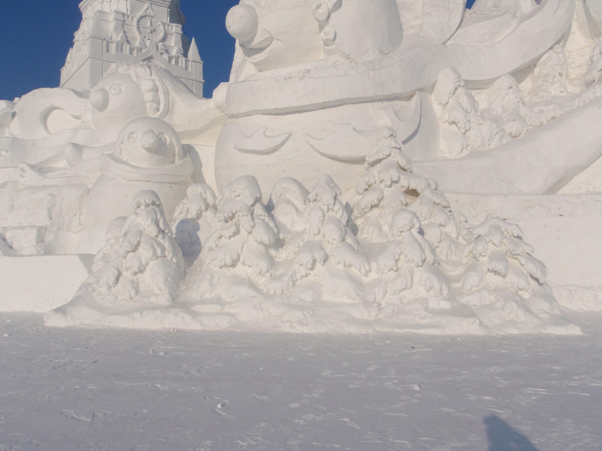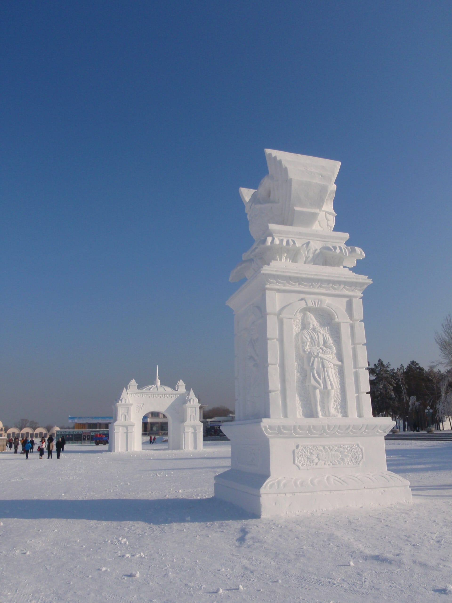 Unlike the illuminated, translucent ice creations at the Ice and Snow World, Sun Island highlights the pure artistry of pristine snow, offering a unique visual experience.