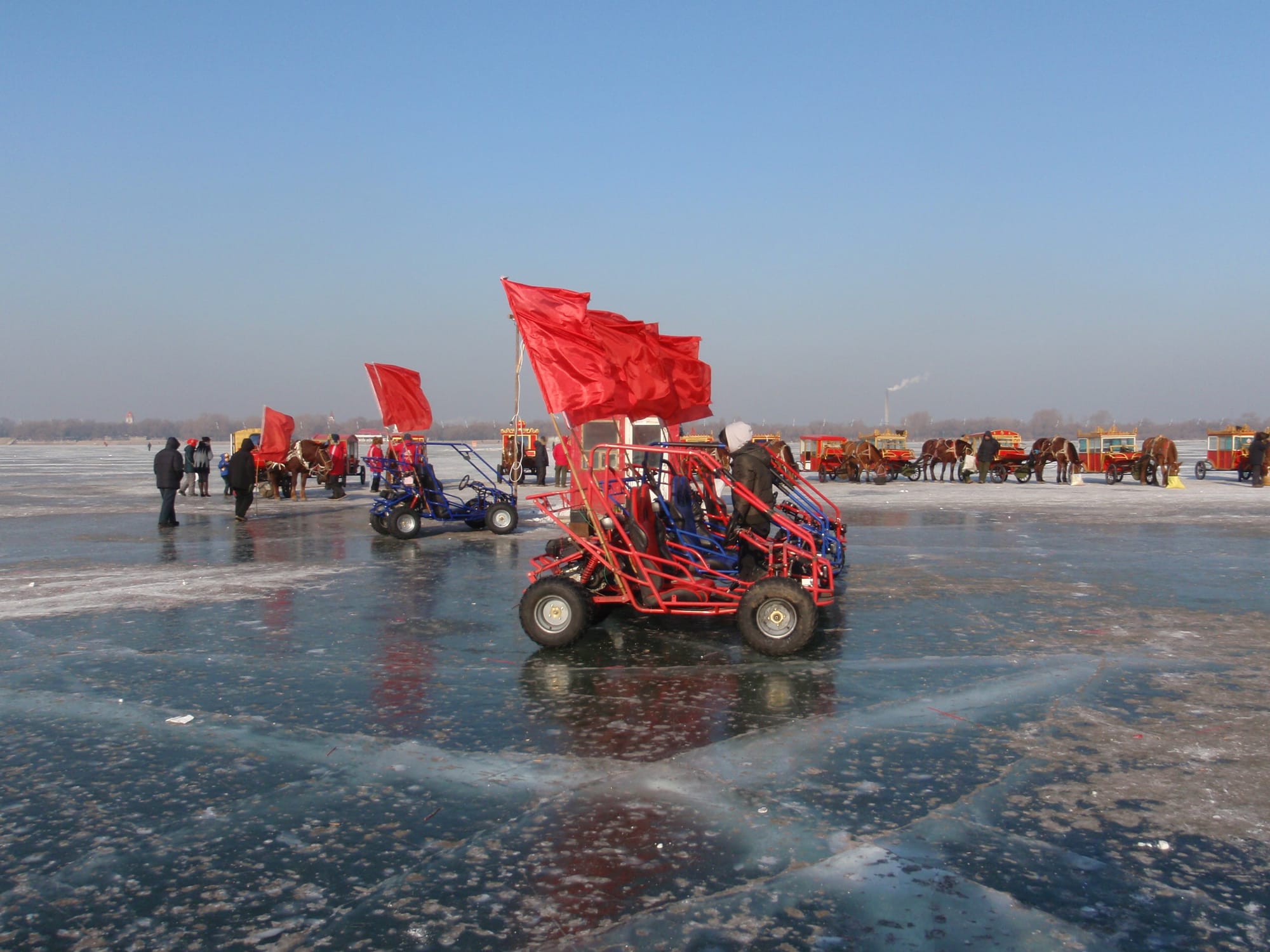 In winter, the frozen landscape transforms into a playground for ice-based activities.